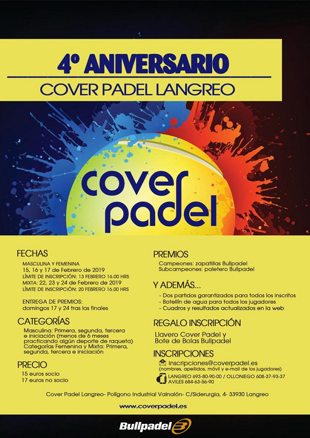 CUADROS MIXTO TORNEO "4ºANIVERSARIO COVER PADEL LANGREO" 21/02/2019 Ya tenéis diponibles los cuadros del torneo de este fin de semana en la categoría de MIXTO. Mucha suerte a todos Nos vemos en las pistas!!!