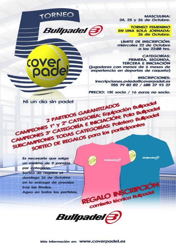 5º TORNEO BULLPADEL 06/10/2014 Tenemos listo ya nuestro uno de nuestros mejores torneos, que ya es un clásico en el panorama padelístico asturiano No te lo puedes perder!! https://scontent-a-lhr.xx.fbcdn.net/hphotos-xpa1/v/t1.0-9/10354820_720859534651314_6236116656060846396_n.jpg?oh=096b416d1d9b48638c033b4d44191012&oe=54C395E7