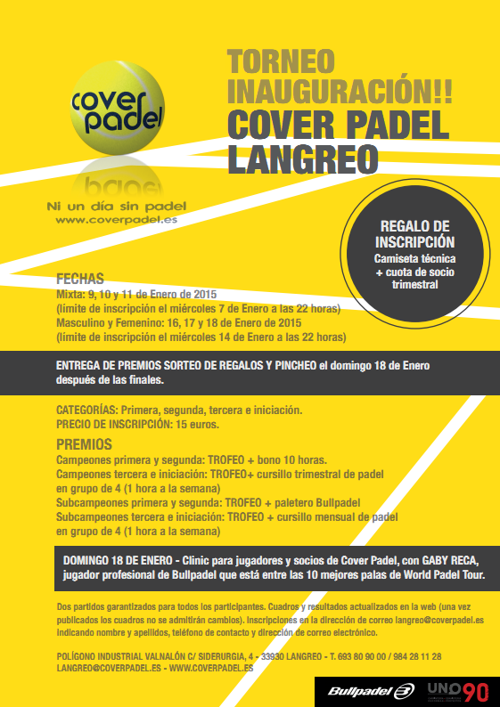 Inscripciones en la dirección de correo langreo@coverpadel.es indicando nombre y apellidos, teléfono de contacto, dirección de correo electrónico y disponibilidad horaria.