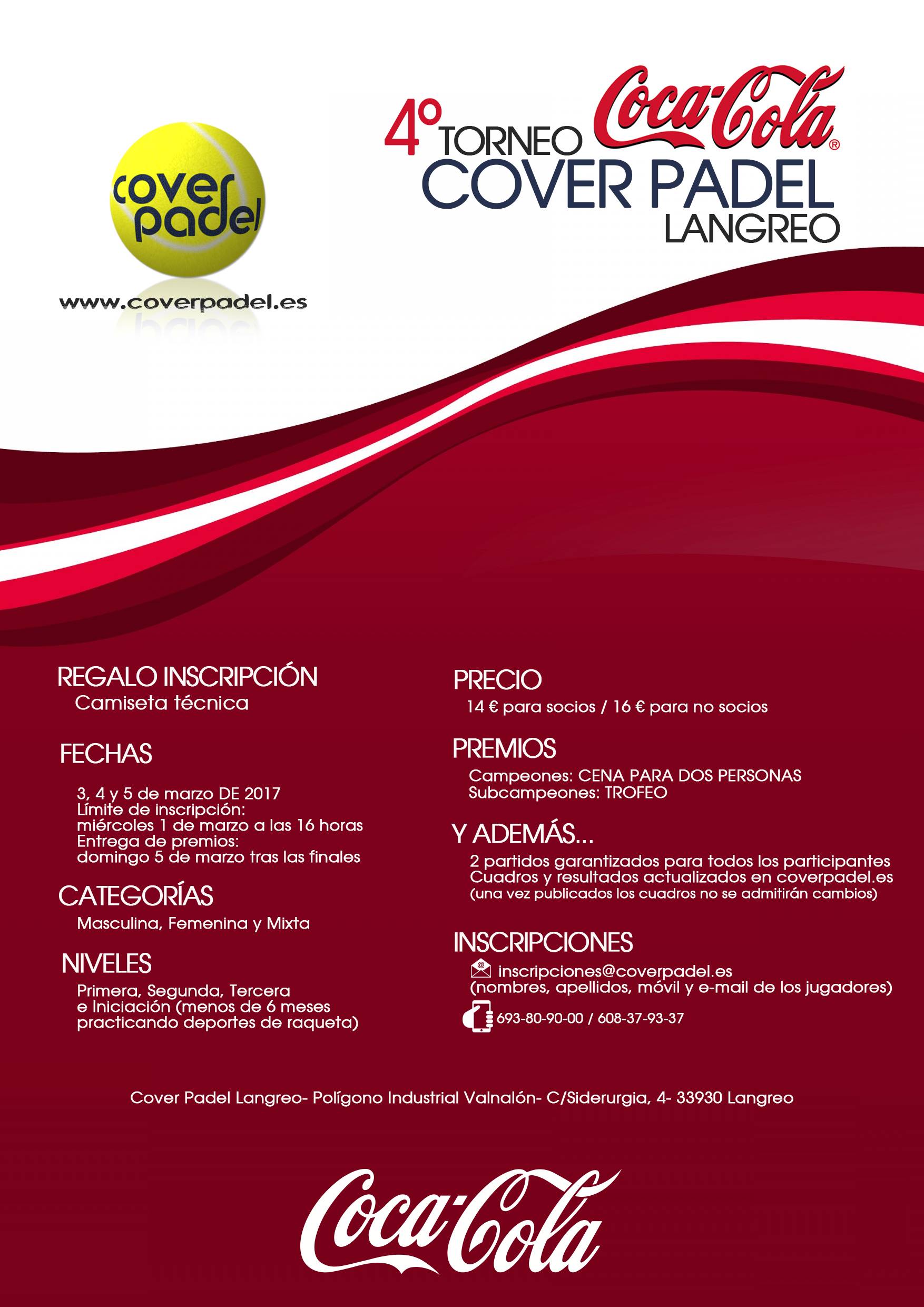 CUADROS "4º TORNEO COCA-COLA" 02/03/2017 CUADROS "4º TORNEO COCA-COLA" Ya podéis consultar vuestros horarios para el torneo de este próximo fin de semana. Gracias a todos por vuestra participación y mucha suerte!! Nos vemos en las pistas