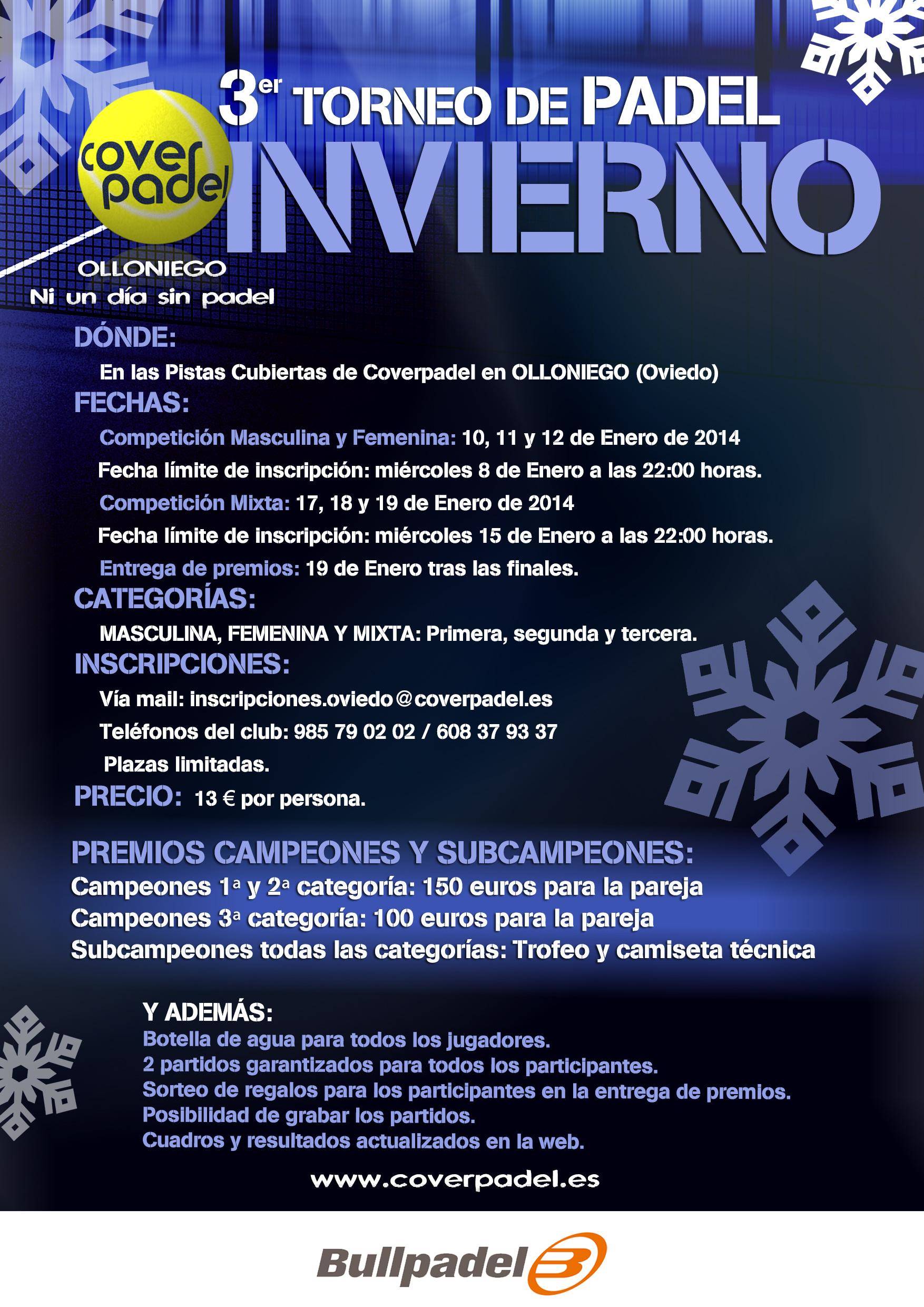 3ER TORNEO DE INVIERNO 28/12/2013 3er Torneo de Invierno Organizador: Cover Padel Olloniego (Oviedo) Fechas Masc y Femenino: 10,11 y 12 de Enero 2014 Fechas Mixto: 17,18 y 19 Enero 2014 Categorías: 1ª, 2ª y 3ª Premios campeones: En metálico por pareja 1ª Cat. 150€, 2ª Cat. 150€ y 3ª Cat. 100€ (mínimo 9 parejas por categoría) Premios finalistas: Trofeo y Camiseta técnica Email inscripción: inscripciones.oviedo@coverpadel.es Teléfono: 985 79 02 02 – 608 37 93 37 (Whatsapp) Inscripción: 13€/persona