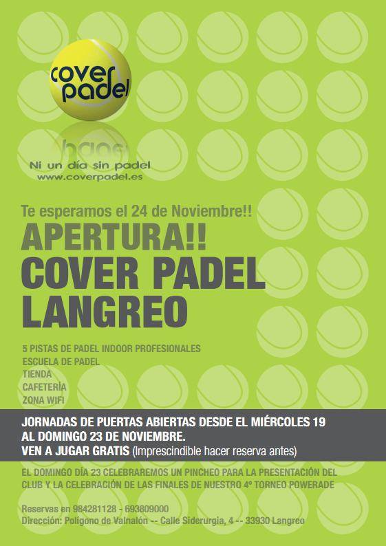 INAUGURACIÓN COVER LANGREO 20/11/2014 Ya casi está listo …. tenemos nuevo club de padel en Langreo Ven jugar GRATIS hasta el domingo día 23 Información y reservas llamando al 693 80 90 00
